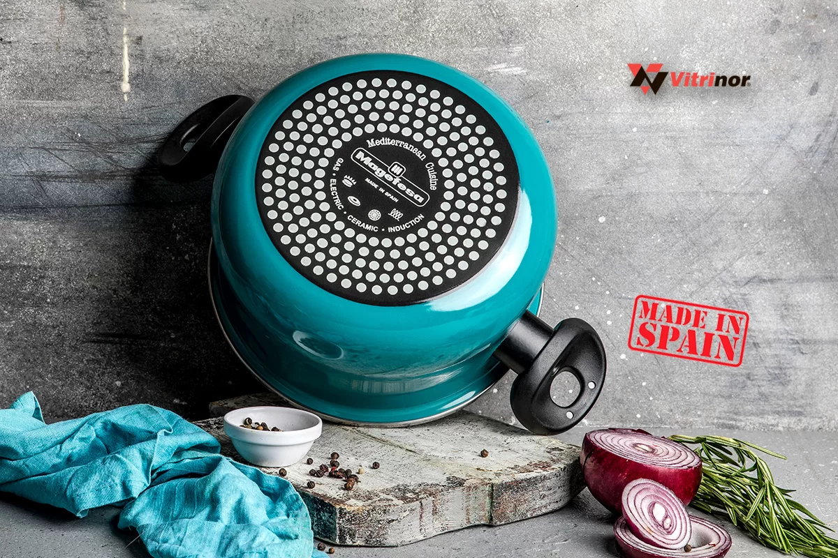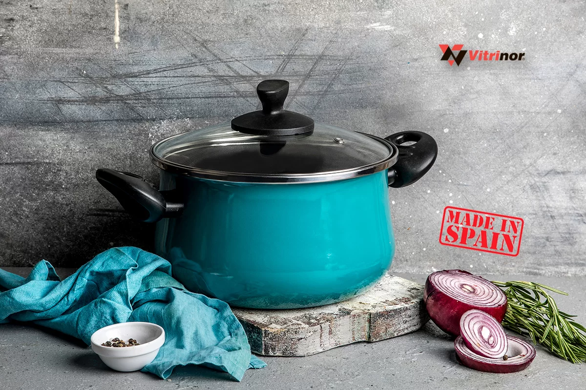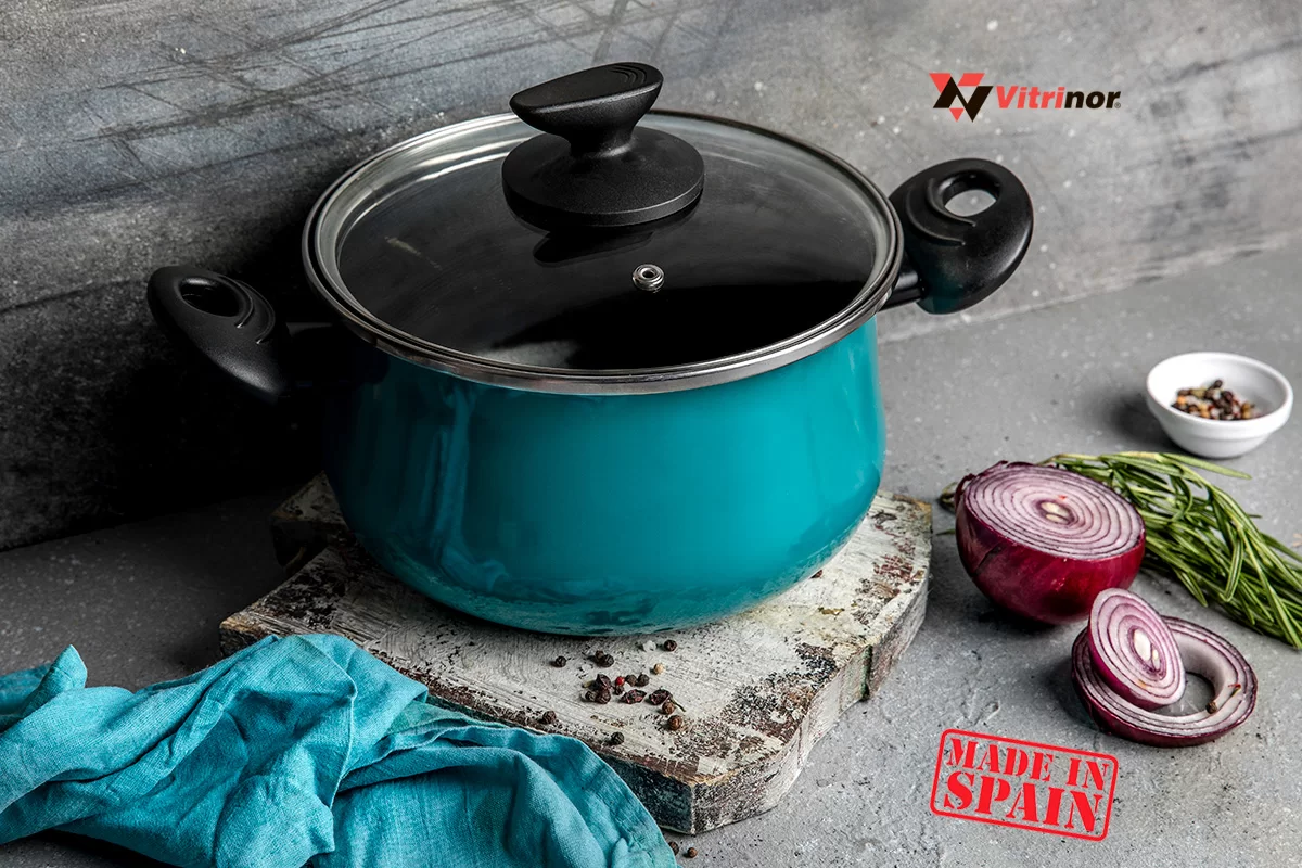 • Внешнее покрытие из двухслойной стеклоэмали, обожжённой при температуре 820ºC, обеспечивает простой уход за кастрюлей, а яркие цвета посуды Vitrinor украсят интерьер любой кухни.