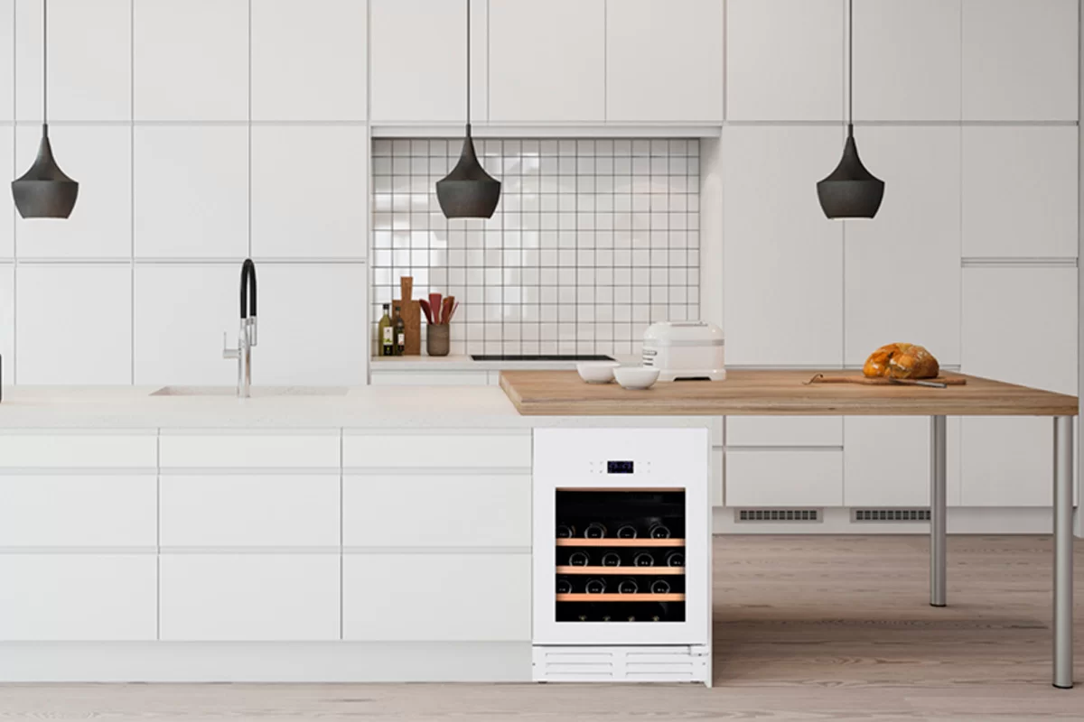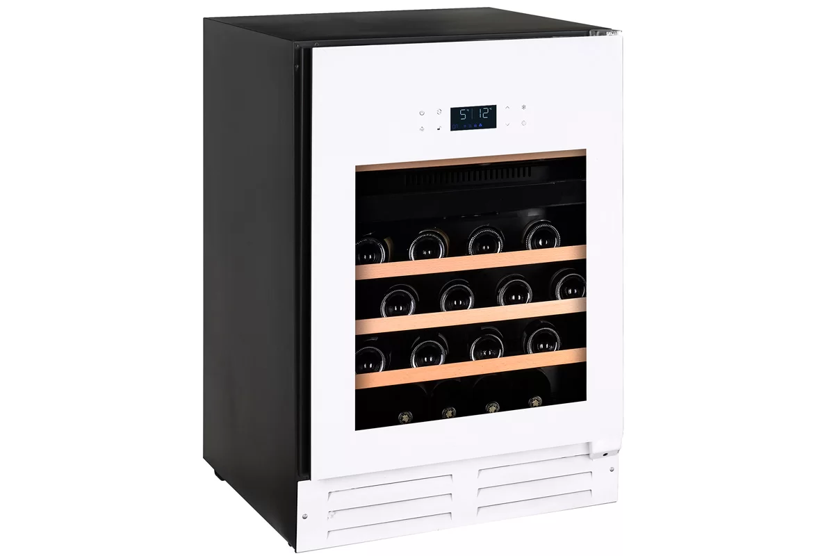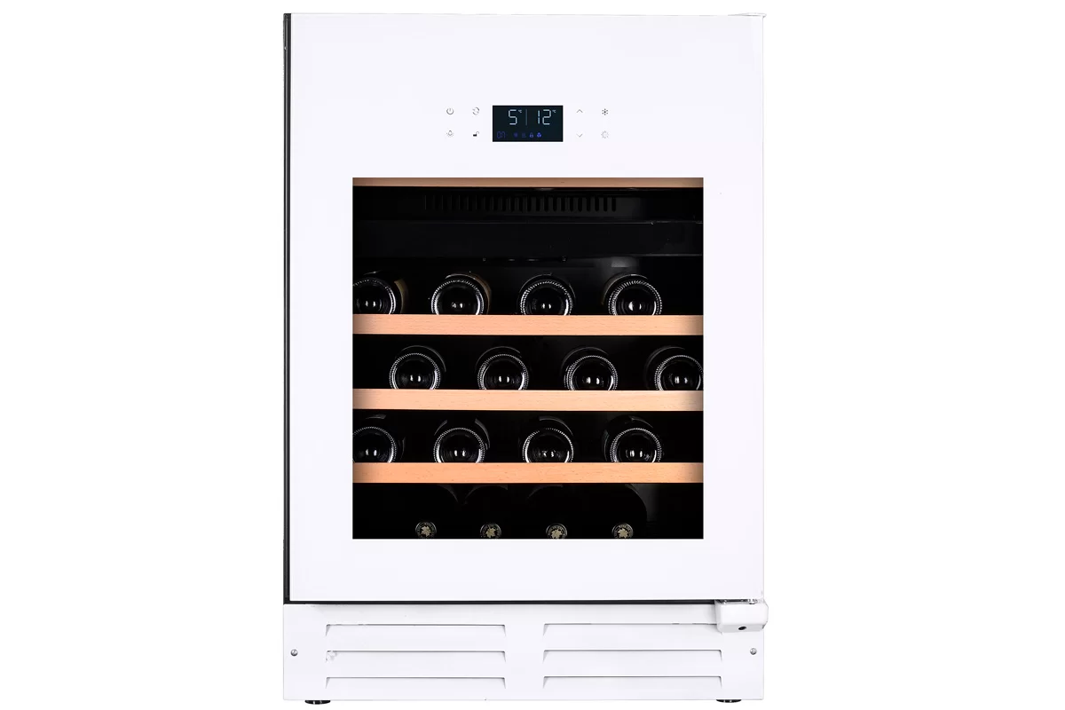 • Винный шкаф имеет элегантный дизайн с фасадом из белого стекла со встроенной ручкой. Прибор оснащен возможностью переключения внутреннего светодиодного освещения между красным и синим цветом.