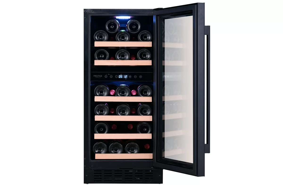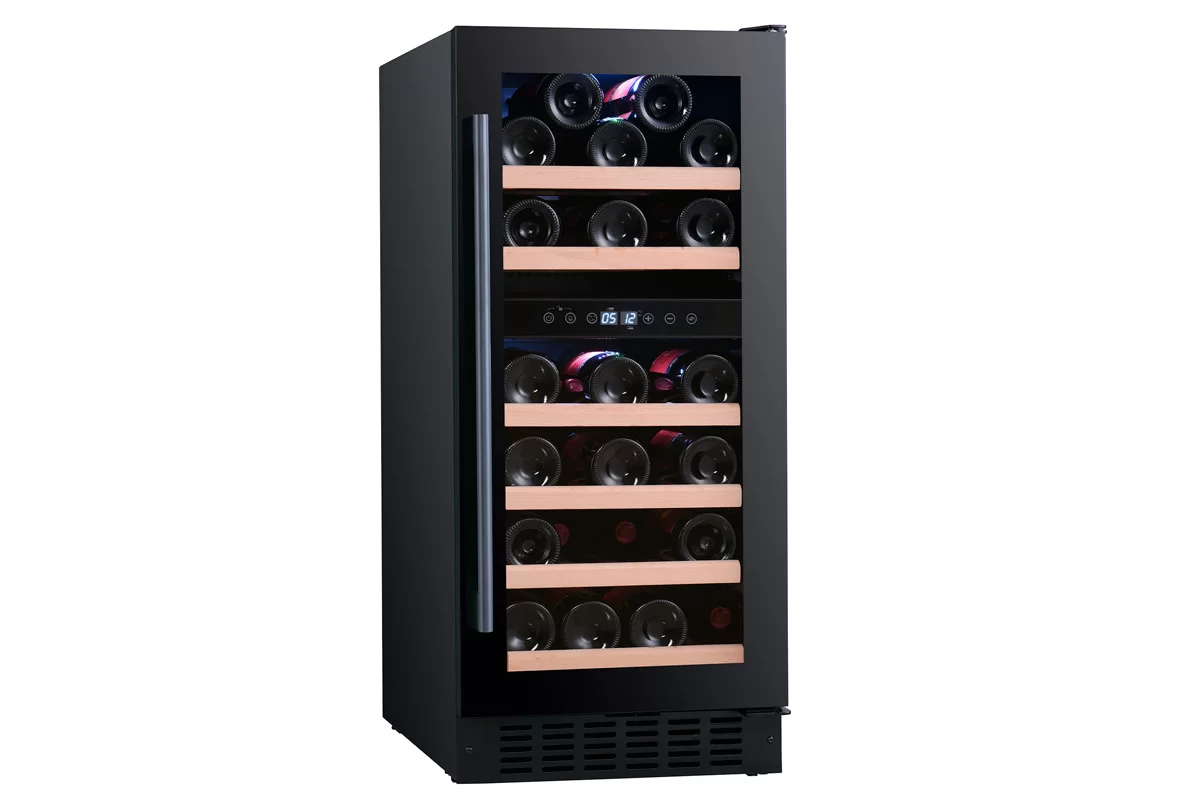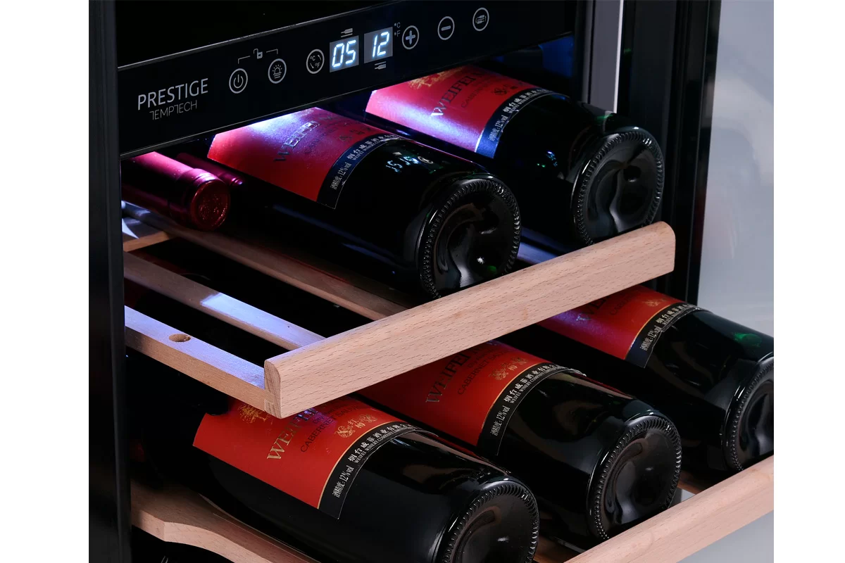 • Винный шкаф Temptech PRESQ38DB с дверцей из черного стекла и двумя температурными зонами.