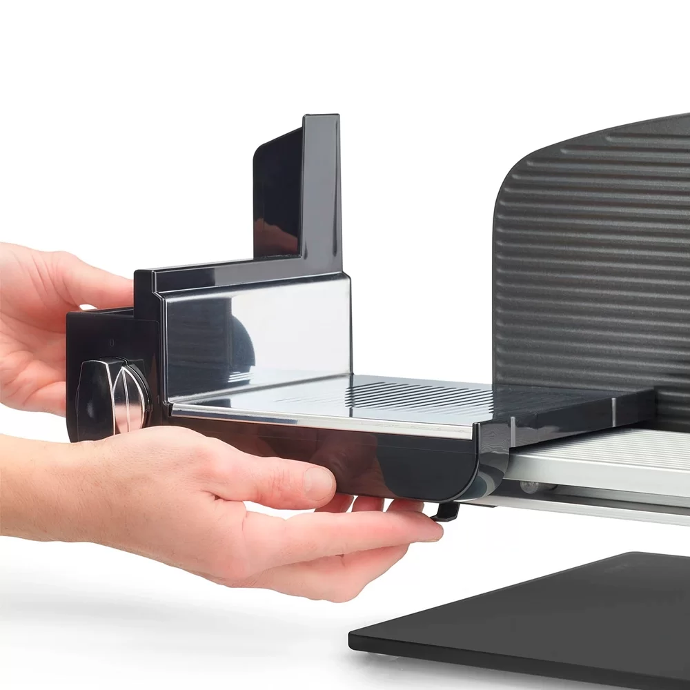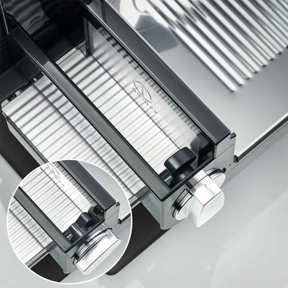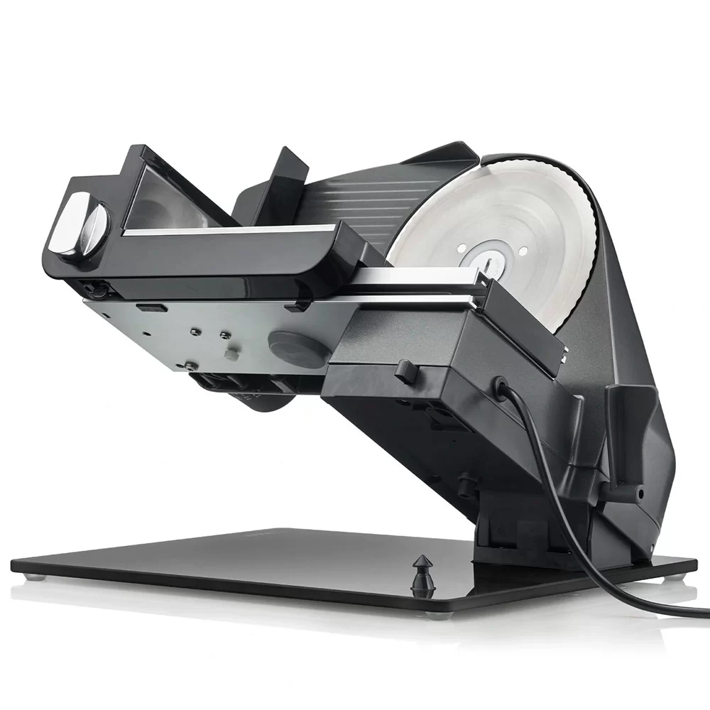 Слайсер с наклоном на 30°. Благодаря функции наклона платформы нарезанные продукты можно удобно складывать на входящий в комплект поддон.